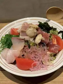 A salad topped with plenty of sashimi, scallops, and seaweed.
