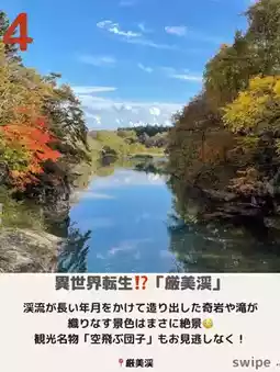 β£ The beautiful scenery of Genbikei Gorge, a scenic spot in Iwate Prefecture πΏβ¨ The landscape of strange rocks and waterfalls, carved over the course of many years by the mountain stream, is truly breathtaking. Enjoy the fresh greenery in spring and the autumn foliage in fall, and the changing scenery of the seasons. Don't miss the tourist specialty, the "Flying Dumplings"! π Access: Approximately 10 minutes by car from JR Ichinoseki Station π Address: Takinoue, Genbi-cho, Ichinoseki City, Iwate Prefecture π° Price: Free (Flying Dumplings cost from approximately 400 yen)