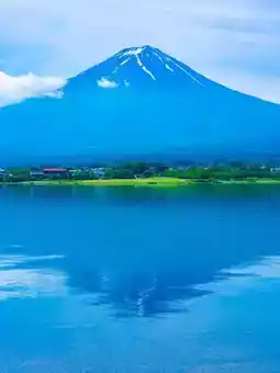 The emerald green lake water reflects the distant Mount Fuji, creating a unique and picturesque scene.