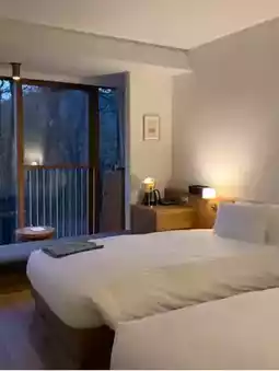 The guest rooms, with their large windows offering expansive forest views, felt like a immersive experience. The warmth of the woods in the interior was simple and comfortable, and at night, the sounds of birds and the wind echoed like lullabies.