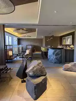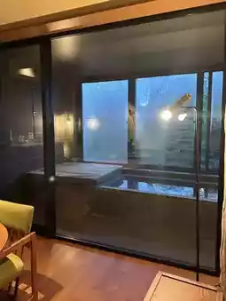 The interiors feature a modern Japanese design, and the windows frame the seasonal landscapes of Hakone's mountains. Mornings are graced with dappled sunlight, while evenings offer a serene soak under a starlit sky, creating unforgettable moments.