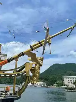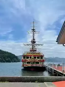 Hakonemachi-ko is a port on Lake Ashi in Hakone. It's the boarding point for the Hakone Pirate Boat, a scenic ferry cruise on the lake. The cruise stops at Hakonemachi-ko, Motohakone-ko, and Togendai-ko. It's the main stop for stunning views of the lake and Mount Fuji. The cruise takes about 25-40 minutes. The boat features 3D art and pirate memorabilia, a fun experience for both children and adults. If you're looking for a change of scenery and a relaxing boat ride with a view of nature, don't miss this.