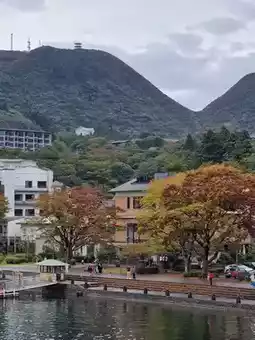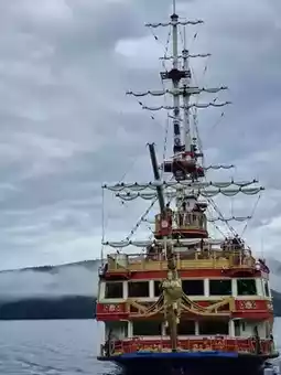 Dreamy Lake Ashi, board the cool-looking Pirate Ship 🏴☠️, and gaze at the faintly visible Mount Fuji 🗻 from the middle of the lake, as if beginning an adventure amid the clear waters and green mountains 🌊. Lake Ashi
