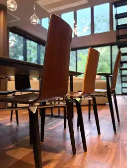 The living room, with its impressive atrium and large windows, is filled with luxury furniture from around the world, including an arflex sofa and Grande Papilio by B&B Italia. The lighting is by Moooi Heracleum. The entire space feels like a design showroom, with its changing appearance between day and night. Equipped with a large-screen projector and a Weber BBQ grill, you can enjoy movies and meals while overlooking the forest.