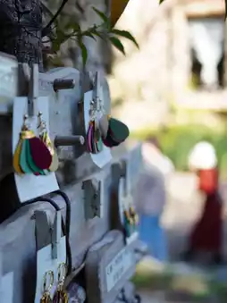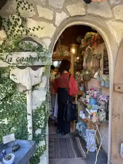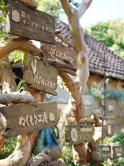 Nestled in a small forest surrounded by tall trees, there are restaurants, cake shops, and general stores scattered throughout.