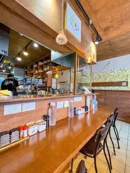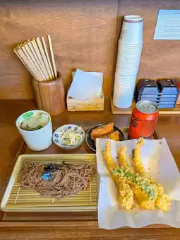 When dining alone, you can sit at the bar table, where you'll find a tray with a water cup, soba noodles, tempura, and condiments like salt, wasabi, and pickled radish. The restaurant provides detailed instructions on how to enjoy soba and tempura more deliciously, along with other useful information, creating a friendly and attentive atmosphere.