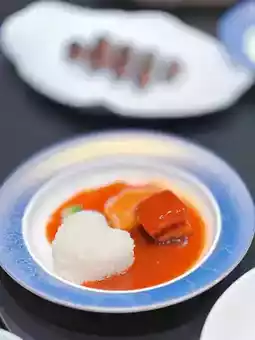 *Braised Dongpo Pork with Fish Maw: The Dongpo pork is served in Ru kiln porcelain, as if one bite could devour half of the "Along the River During the Qingming Festival." The vibrant red sauce is sweet and savory, the meat tender and soft, with a perfect balance of fat and lean—a true rice companion.