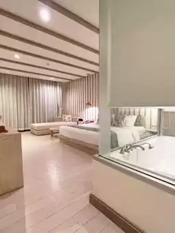 The rooms are decorated in a contemporary Lanna style 🏡, featuring warm wood tones and white accents. The comfortable beds 🛏️ feature spacious balconies with mountain views 🌤️. Some rooms feature bathtubs 🛁 and private pools 🏊♀️. The resort offers a full range of amenities 📺📶, giving the feel of a luxurious jungle retreat 💫.