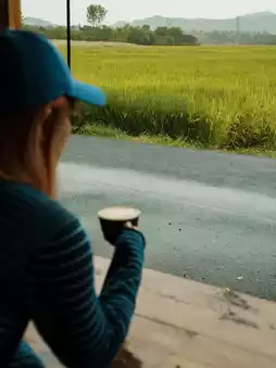 ◽️ The cafe has a great view of the rice fields and pink muhly grass.