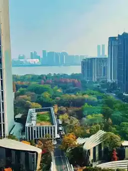 Behind it, the InterContinental Hangzhou stands like an elegant gentleman, quietly guarding the beautiful scenery. The hotel's glass curtain wall reflects the brilliance of the golden ball and the splendor of the balcony, with light and shadow intertwined. Stepping into the hotel lobby, the warm yellow lights blend with the autumn light outside, and the air is filled with the aroma of coffee and the fragrance of tea. The InterContinental Hangzhou has been around for a while, but it is well-maintained. The buffet breakfast and gym are good, and you can see the river. Across the river is the Shimao Wisdom Gate.