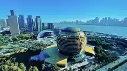 On the banks of the Qiantang River, the dazzling golden ball of the Hangzhou International Conference Center looks like a ripe golden fruit that has fallen from the sky. It stands proudly, with its metallic luster contrasting with the clear blue sky. The air around it seems to be gilded, and every texture is engraved with the splendor of autumn, telling the story of the city's journey to the world. Hangzhou International Conference Center