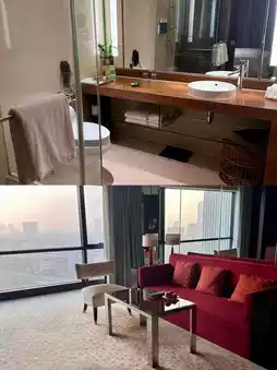 2. Room Type/Layout: The bedroom area of the suite is not large, but the living room is quite spacious, with two bathrooms. Opening all the curtains, you can see a wide view through the floor-to-ceiling windows. The overall layout is reasonable.