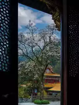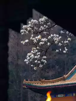 ① In front of the Mahavira Hall: Magnolia grows against the ancient hall, and the fragrance of Buddhist incense makes it more elegant;