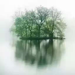 The misty lake surface, lush green trees gathered on the small island in the middle of the lake, its reflection extending clearly across the mirror-like water, like a dreamy wonderland.