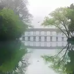 On a spring morning, the mist-shrouded lake surface is like poetry and a dream. The Chinese pavilion and gallery are surrounded by lush green trees, and the reflection in the water complements each other.