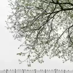 Under the gray sky, the branches are dotted with new green, a row of birds quietly perch in the water fence, the tranquil picture shows the rhythm of spring.