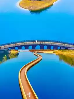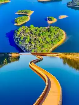 Like a golden dragon hovering over the azure lake, connecting the islands. It's incredibly stunning! Perfect for photos, don't miss it.