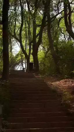 Follow the mountain steps or gentle slope uphill, surrounded by green shade and fresh air.