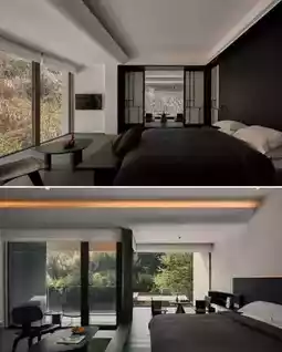 The color tone is mainly gray and black, integrating sharp lines and restrained colors, blurring the boundary between mountains and luxury. The public areas are full of hidden sceneries: the tea house and the "Qingquan Stone" landscape complement each other, and a mountain spring flows down in the backyard; the "Huanxisha" infinity pool reflects the sky and clouds, and the camping lawn "Tashaxing" can be used for weddings and team building.