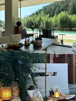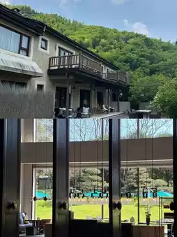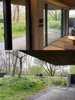 Floor-to-ceiling windows bring in natural scenery, interiors feature grey and brown color schemes, complemented by custom furniture, tatami tea areas, BOSE speakers, and Dyson hair dryers.