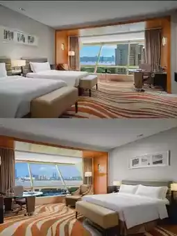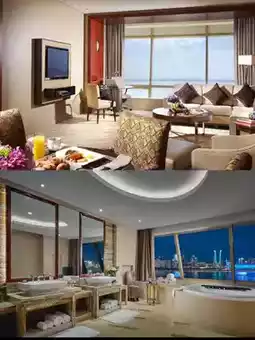🌁 Decor Style: Designed with the concept of "Sun and Moon Shining Together," the hotel boasts a dazzling golden spherical exterior. The lobby is grand with high ceilings, featuring a blue and gold color scheme and streamlined decorations. It blends modern art with the vibrancy of a Jiangnan water town, creating a nighttime spectacle as if stars have fallen to earth.