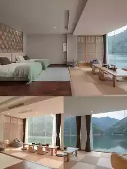 The full-house floor-to-ceiling windows + tatami design is absolutely amazing!! Woken up by the morning sunshine ☀️, opening your eyes to a screen full of green mountains and sea of clouds~ Our river-view room comes with a huge terrace where you can drink tea and read books while listening to the sound of the stream. You won't even want to touch your phone!!