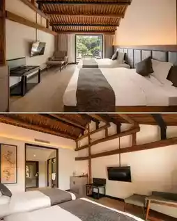 Meticulously crafted over three years by the China Academy of Art, this retreat perfectly blends century-old rammed earth architecture with wild luxury. The weathered rammed earth walls whisper ancestral tales, while black steel frames and floor-to-ceiling windows outline modern textures. The treehouse restaurant hovers among the pines, and the infinity pool mirrors the sky and clouds. Every design follows the philosophy of a "realm of relaxation," balancing the ruggedness of the wilderness with the refined elegance of a five-star hotel.