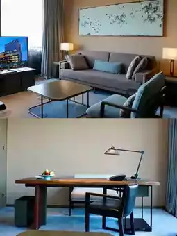 The public areas of Hangzhou Park Hyatt are grand, while the rooms are meticulously detailed. From the ground floor lobby to the 37th-floor check-in area, the high ceilings combined with Yabu's signature neo-Chinese design—featuring marble or metal light fixtures extending to the ceiling—create an aura of opulent grandeur. The rooms are adorned with plum blossom motifs and teal accents against dark wood finishes. The plum blossom lighting on the headboard only reveals itself at night, a subtle yet thoughtful touch.