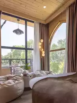 Every design in the treehouse is a hit for aesthetics! The furniture in natural wood tones showcases its grain, and handmade woven tapestries adorn the walls. Every corner is filled with ambiance~
