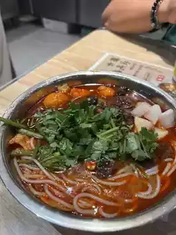 Snail noodles are served in a spicy and sour soup with fragrant Chinese herbs, topped with pickled vegetables, peanuts, fried tofu, and soft glutinous rice noodles. The complex flavors are spicy, salty, and sour, all in one bowl.