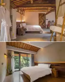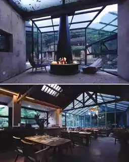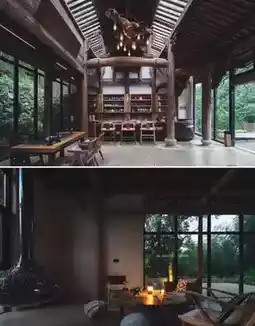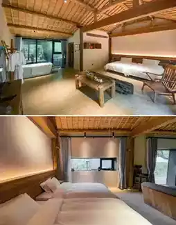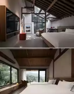 Surrounded on three sides by nearly 2,000 acres of pristine wilderness, more than 40 ancient houses dating back 800 years have been restored, preserving stone walls, blue tile roofs, and ancient carved steles. Thirty courtyards are scattered along the creek, resembling a miniature secret realm of the Taoist Thirty-Six Caves of Heaven. Old beams and antique objects have been skillfully revived by artisans, and decayed trees transformed into unique artistic tables and chairs. Glass curtain walls blur the boundary between indoors and outdoors, with tea tables facing bamboo groves and streams, where incense gently rises accompanied by the clear sound of flowing water.