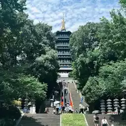 🌉 This newly restored pagoda houses an air-conditioned museum with artifacts from the original site. It also houses beautiful painted sculptures depicting famous Chinese folktales. You can reach the top floor by elevator, offering stunning 360-degree views of the surrounding West Lake and Hangzhou. Shuttle buses operate from the temple entrance to other drop-off points along the West Lake. Shuttle fares range from 20 to 80 yuan. It's a 5-10-minute walk from the entrance to 苏堤, past a Starbucks and a Chinese restaurant. The entrance to the tower costs 40 yuan per person. Upon ascending to the first floor, you'll find the ruins of an old tower. The stairs to the second floor are on the left side of the tower. Once you reach the second floor, you can take the elevator or the stairs to the tower. There was a long queue for the elevator, and the elevator doesn't go to the top floor. You still have to climb the stairs to reach the top floor. The view from the top is good, but it can be a bit crowded, even on weekdays. You can enjoy the surrounding West Lake and the strong wind. We visited in summer. Therefore, it's especially nice to take a break to enjoy the view and cool off.