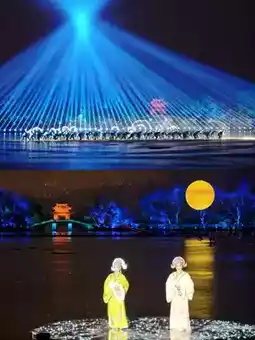 As night fell, the calm surface of West Lake turned into a stage of magic — shimmering lights, floating dancers, and music that echoed across the water. The reflections made it hard to tell where the lake ended and the sky began 🌊💫.