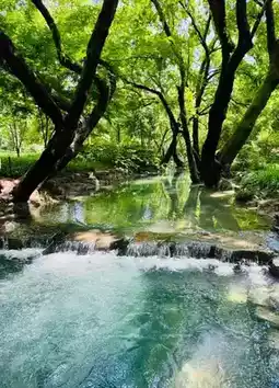 Jiuxi, located in the southwest part of the West Lake Scenic Area in Hangzhou, is a stream winding through the mountains and forests. The beauty of the mountains and waters here is captivating. Strolling along Jiuxi, you will find green trees shading the path, birds singing, flowers fragrant, and the gentle sound of flowing water. The air here is fresh, making you feel as if you are in a natural oxygen bar. The smoke trees are another major feature of Jiuxi. Under the sunlight, the trees and hills by the stream appear faintly through the mist, forming a beautiful picture.