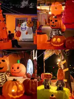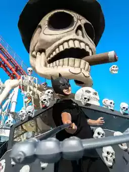 This theme park boasts a variety of Halloween-themed decorations, including pumpkin lanterns, giant skulls, and spooky castles, perfect for both day and night photography.