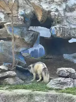 Further ahead was the area for the Arctic fox. Its fur was fluffy and thick, with a gradient of white to gray, making it look particularly beautiful. It slowly walked back and forth in front of the cave, occasionally looking up at us. My brother said, "It looks like the fox is looking for something to eat." My father joked, "Maybe it's looking for the candy you just dropped." My brother immediately felt in his pocket and said, "Huh? My candy is really gone!" We burst out laughing.