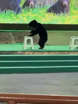Walking inside, we came across the bear show. We happened to catch a show. A trainer in a red coat was on stage, and a large black bear stood on its two legs and even hugged the trainer! The children were stunned. The younger brother clapped his hands excitedly, "The bear really is obedient!" The older sister looked in amazement, "It looked like it was smiling!" The whole show lasted about ten minutes, with the bear dancing, waving, and handling props, keeping the audience laughing.