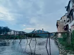 Arriving at Heqiao at dusk, under the twilight, the flowing stream and distant picturesque mountains make it seem like a fairyland! Our family of four walked across the wooden bridge, becoming part of the painting💕