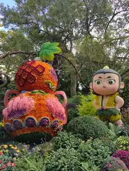 The chrysanthemums here hold diverse romance. Among the more than 1,200 exquisite chrysanthemums in the Yuquan Fish Leap Scenic Area, there are both national treasures and overseas newcomers. Tower chrysanthemums rise like peaks, cliff chrysanthemums resemble waterfalls, poetically reflecting with the Yuquan koi. Fifteen artistic installations hold more surprises: "Gourd Child Memories" awakens childhood memories with chrysanthemums and vines; "Flowers Blooming on Hangcheng Road · Digital Blossoms" sparks technological romance with drone flower waterfalls and robot dogs; "Mandarin Fish Wave Fishing Fire," made from recycled old clothes, tells the philosophical story of circular ecology.