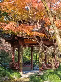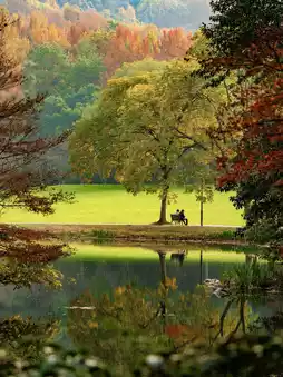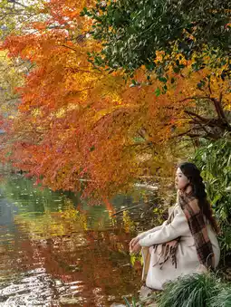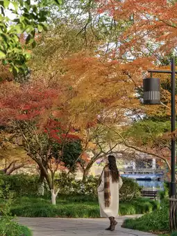Walking under red maple trees, mandarin ducks playing in the blue lake,