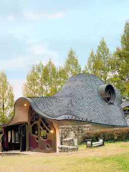 With its pointed-roof huts, mushroom-shaped buildings with round windows and curved roofs, forest paths, and playful objects, it's as if you've wandered into a storybook. 🍄
