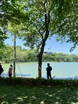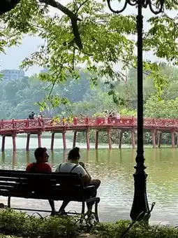 In the middle of the lake, you’ll spot a red wooden bridge leading to Ngoc Son Temple. Crossing it feels like entering a hidden world, full of old stories and soft breezes.