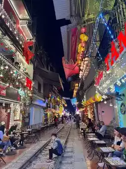 💗It is a street with a railway track in the middle with a real train running through it. On both sides of the road are cafes and restaurants lined up next to each other.