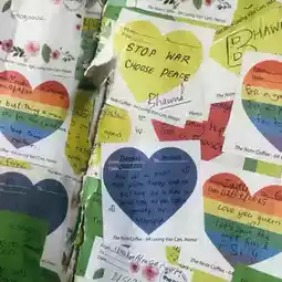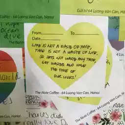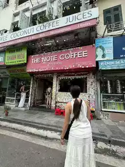 ☕️ Note Coffee is a famous coffee shop in Hanoi. Many people have been telling us to try it because it's a charming and unique coffee experience. When we first saw it, we were shocked! The shop was covered in colorful sticky notes from travelers from all over the world, plastered all over the place. Once we entered, the atmosphere was filled with positive vibes. Writing your own notes and reading others' notes was a heartwarming experience. 🥰💞 The menu offers a wide variety of items, but we tried the croissants, red velvet cake, coconut coffee, and chocolate egg. The chocolate egg was delicious, but we prefer the ones we drank in other coffee shops. The red velvet cake was incredibly soft. The croissants were also good. My friend said they were delicious, but I personally felt it was a bit bland and didn't have enough butter. My friend also said the coconut coffee was more of a frappe/dessert than a coffee. The menu doesn't mention a shake, just a bit cold. 😂😆 We had a great seat in the shop (a window seat on the first floor), which allowed us to enjoy a beautiful view of the city. Especially since it was a weekend, the street was closed to tourists. But be warned, if you sit here, you'll have to try the coffee. Everyone will see you too 🥰👍🏻