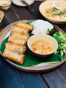 The sweet yet rich caramelized pork (think of it as braised pork with soy sauce) was addictive when paired with rice, and the fresh Stir-fried Morning Glory was light yet full of flavor. The Egg Spring Rolls were crispy on the outside and soft on the inside, perfectly satisfying. 🥢