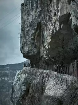 There are two routes to ascend Gulu Village. For hiking enthusiasts with good stamina and a thirst for challenge, you can choose to start from the "Yixiantian" parking lot and climb along the ancient road once used for transporting goods via mules and horses. This path, carved into the cliffs, is approximately 3 km long with a vertical drop of nearly 1,000m. You'll need to use both your hands and feet to climb, taking about 3 hours to reach the summit. Despite the arduous journey, the scenery along the way is stunning, and every step allows you to feel the awe and charm of nature.