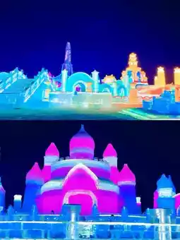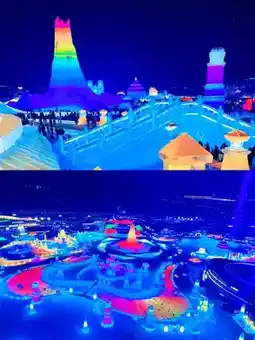 Harbin Ice and Snow World is an enchanting ice kingdom. During the day, you can capture the crystal-clear quality of ice and snow. At sunset, golden to pink sunlight shines on the ice blocks, creating breathtaking beauty. At night, when all the lights turn on, it's incredibly magical. The package also includes a Ferris wheel, giant slide, Harbin Ice Show Theater, and Car Ballet Show. Remember to dress warmly!