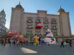 In winter, Harbin Pharmaceutical No.6 transforms into a magical fairytale scene. A giant snowman installation, complete with a colorful hat and scarf, along with a heart-shaped decoration on its chest, brings warmth and vibrancy to this industrial heritage site. Nearby, a playful Santa Claus figure appears to be "hanging" from the building's windows, creating delightful holiday cheer alongside the snowman. These charming installations captivate both children and adults alike, evoking nostalgic childhood joy.