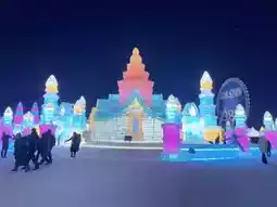 Colorfully lit ice castles, palaces, and towers that look like a frozen fairy tale