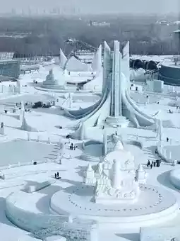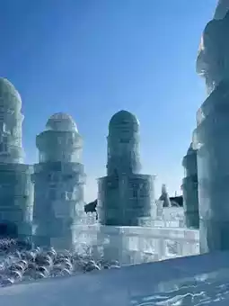 Massive ice sculptures and buildings carved from blocks of ice taken from the nearby Songhua River